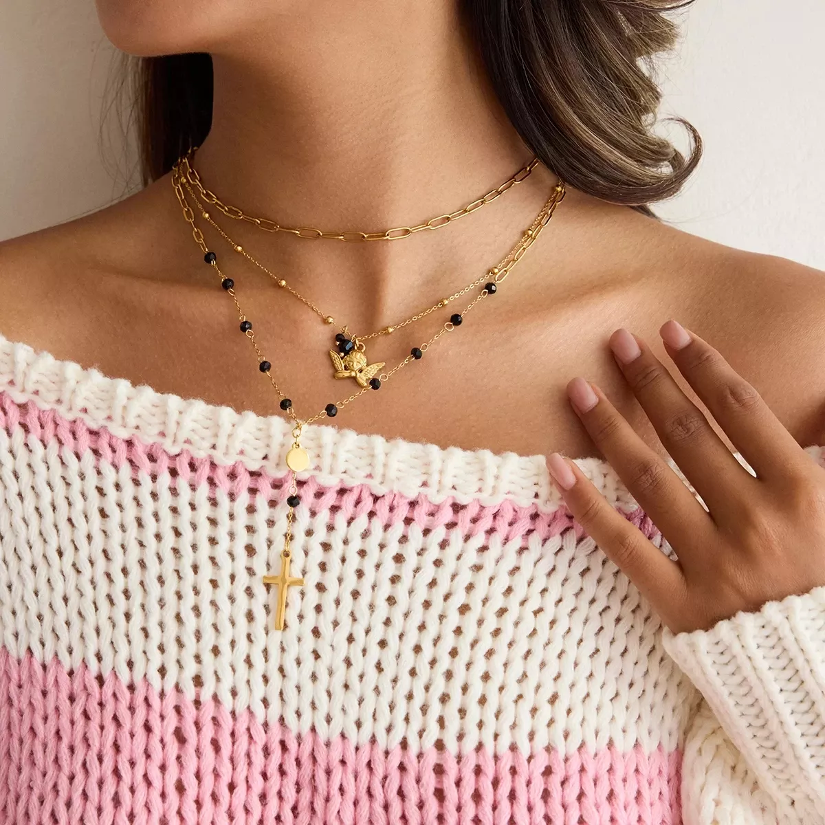 Featuring a meticulously carved black natural stone angel pendant, this necklace hangs from a bead chain and is bathed in a rich 18K gold hue that gleams beautifully against all skin tones. Crafted with care from high-quality stainless steel, it’s built to resist water, tarnish, and daily wear—keeping your style flawless in any setting.