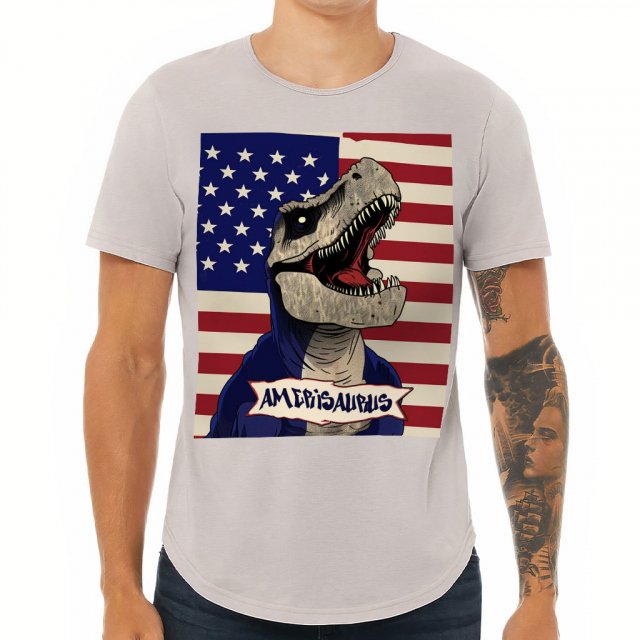 Amerisaurus Curved Hem T-Shirt – USA Flag T-Shirt – Patriotic Curved Hem Tee