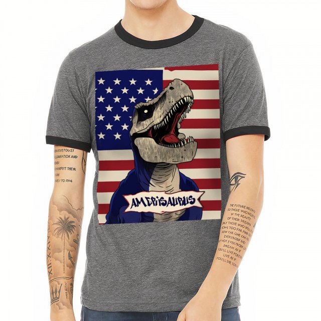 Amerisaurus Ringer T-Shirt – USA Flag T-Shirt – Patriotic Ringer Tee