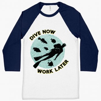 Dive Now Work Later Baseball T-Shirt – Diving T-Shirt – Text Design Tee Shirt
