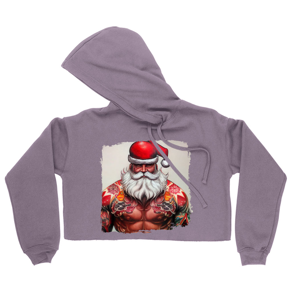 Biker Santa Women’s Cropped Fleece Hoodie – Badass Santa Cropped Hoodie for Women – Art Print Hooded Sweatshirt