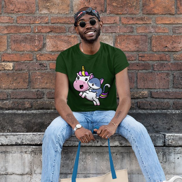 Cat Riding a Unicorn Heavy Cotton T-Shirt – Cute Design Tee Shirt – Cartoon T-Shirt