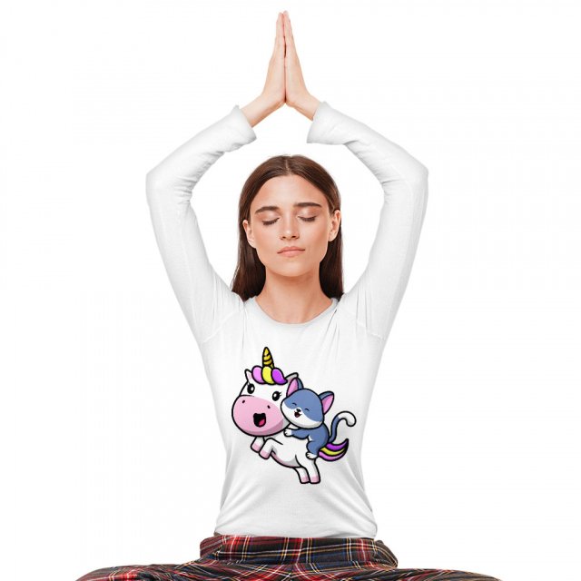 Cat Riding a Unicorn Long Sleeve T-Shirt – Cute Design T-Shirt – Cartoon Long Sleeve Tee Shirt