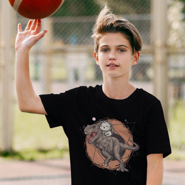 Cat Riding T Rex Kids’ T-Shirt – Kawaii T-Shirt – Cool Design Tee Shirt for Kids