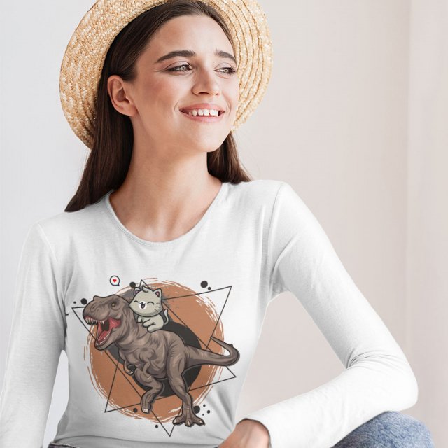 Cat Riding T-Rex Long Sleeve T-Shirt – Kawaii T-Shirt – Kitten Long Sleeve Tee Shirt
