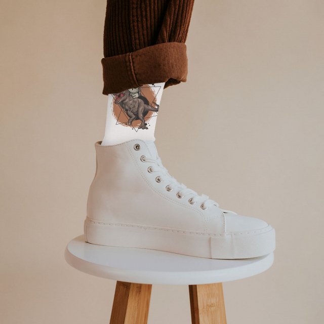 Cushioned foot bottom makes Cat Riding T-Rex Socks a sure bet for everyday wear, from work, play, gym, sports, and beyond. These socks are designed to be all-season. This product is made breathable for when it’s warm but thick enough for when it’s cold during the winter.