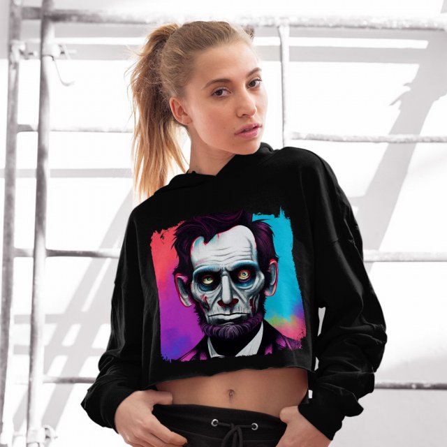 Cool Lincoln Women’s Cropped Fleece Hoodie – Zombie Apocalypse Cropped Hoodie for Women – Pop Art Hooded Sweatshirt