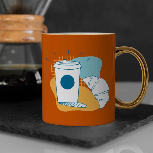 Croissant Mug – Coffee Themed Gold Rim and Handle Mug – Artwork Mug