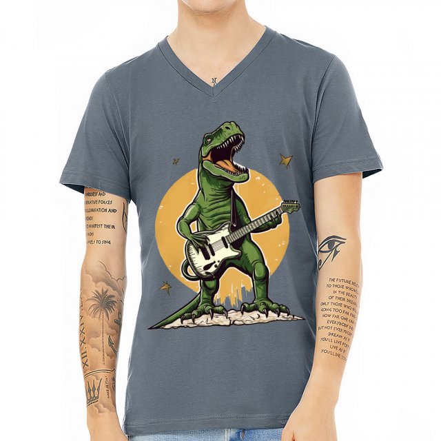 Dinosaur Playing Guitar V-Neck T-Shirt – Print T-Shirt – Music V-Neck Tee