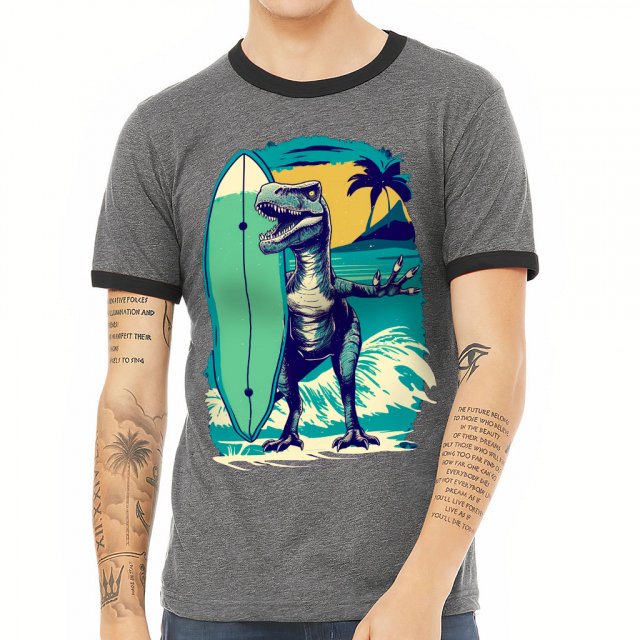 Dinosaur Surfer Ringer T-Shirt – Retro T-Shirt – Cool Ringer Tee