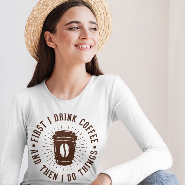 First I Drink Coffee Then I Do Things Long Sleeve T-Shirt – Sarcastic T-Shirt – Cool Graphic Long Sleeve Tee Shirt