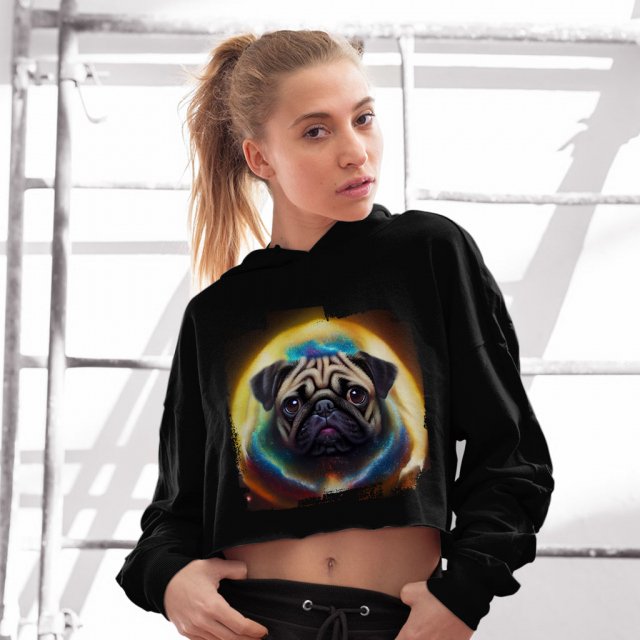 Galaxy Dog Women’s Cropped Fleece Hoodie – Pug Cropped Hoodie for Women – Space Hooded Sweatshirt