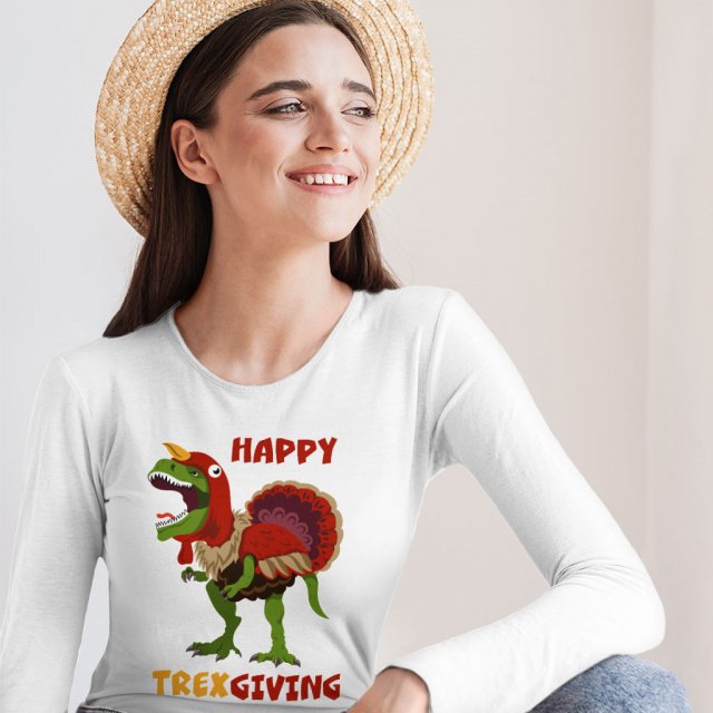 Happy Thanksgiving Long Sleeve T-Shirt – Funny Dinosaur T-Shirt – Holiday Long Sleeve Tee Shirt