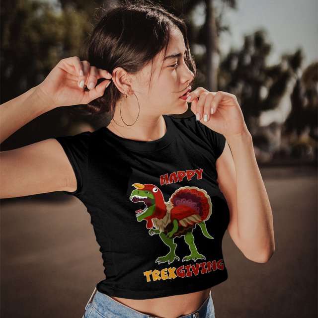 Happy Thanksgiving Women’s Cropped T-Shirt – Funny Dinosaur Crop Top – Holiday Crop Tee Shirt