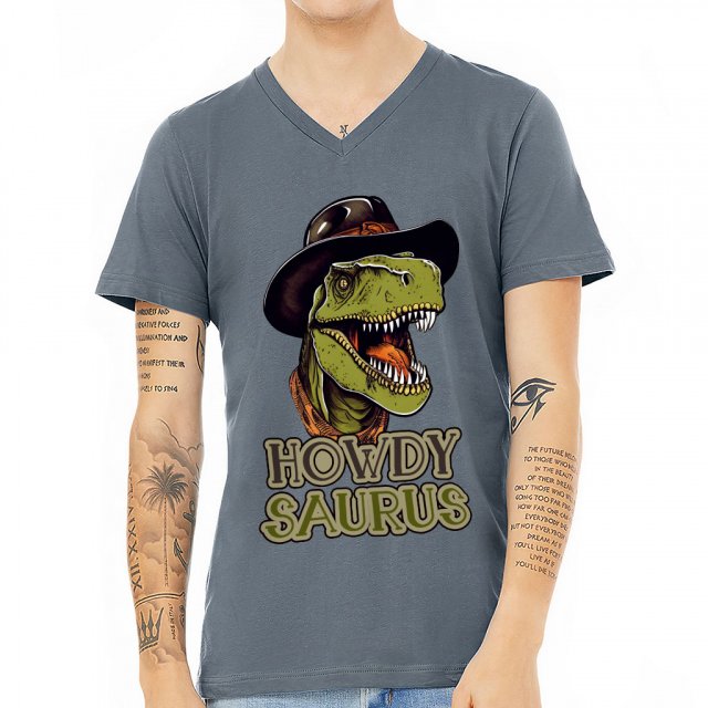 Howdy Saurus V-Neck T-Shirt – Unique T-Shirt – Dinosaur V-Neck Tee