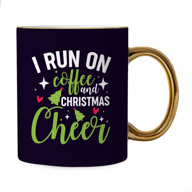 I Run On Coffee And Christmas Cheer Mug – Christmas Tree Gold Rim and Handle Mug – Holiday Mug