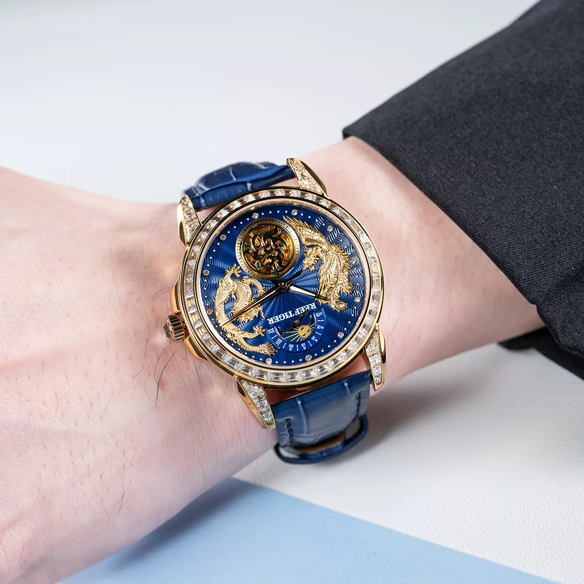 Step into a world where art meets precision. This exquisite men’s luxury watch combines powerful symbolism with refined craftsmanship. The round case, adorned in warm rose gold tones, frames a dial alive with intricate dragon and phoenix motifs—timeless emblems of strength, harmony, and prosperity. Diamond accents shimmer like stars around the design, while the deep blue leather strap adds a bold, regal contrast. Every glance at your wrist becomes a statement of taste, confidence, and distinction.