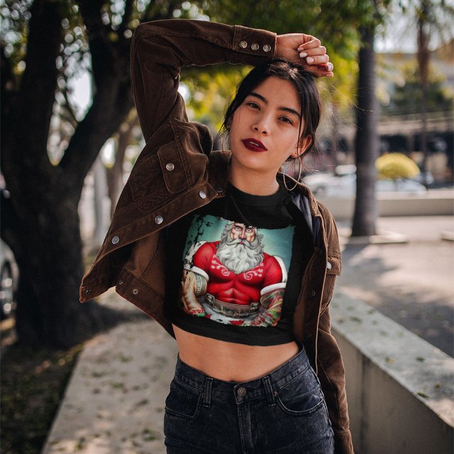 Looking for something unique in a cropped T-shirt? Check out Santa Claus. This shirt is form-fitting and has a silhouette that will show off your figure. Whether you’re pairing it with jeans or shorts, Christmas is sure to turn heads.
