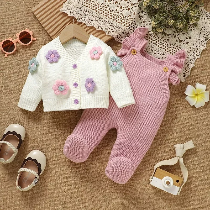 Dress your baby girl in pure comfort and charm with this Newborn Baby Knit Clothes Set. Perfectly crafted for everyday wear and special occasions, this delightful outfit includes a cozy cardigan and a matching long sleeve romper. Designed with attention to detail, it features a cute 3D flower pattern that adds a touch of sweetness to your baby’s wardrobe. The soft knit fabric feels gentle against delicate skin, making it an ideal choice for newborns and infants aged 0–9 months.