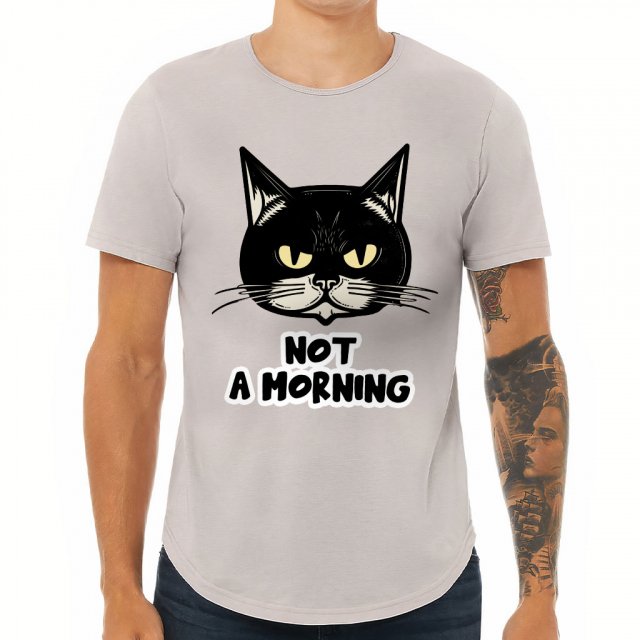 Not a Morning Curved Hem T-Shirt – Cat Face T-Shirt – Drawing Curved Hem Tee