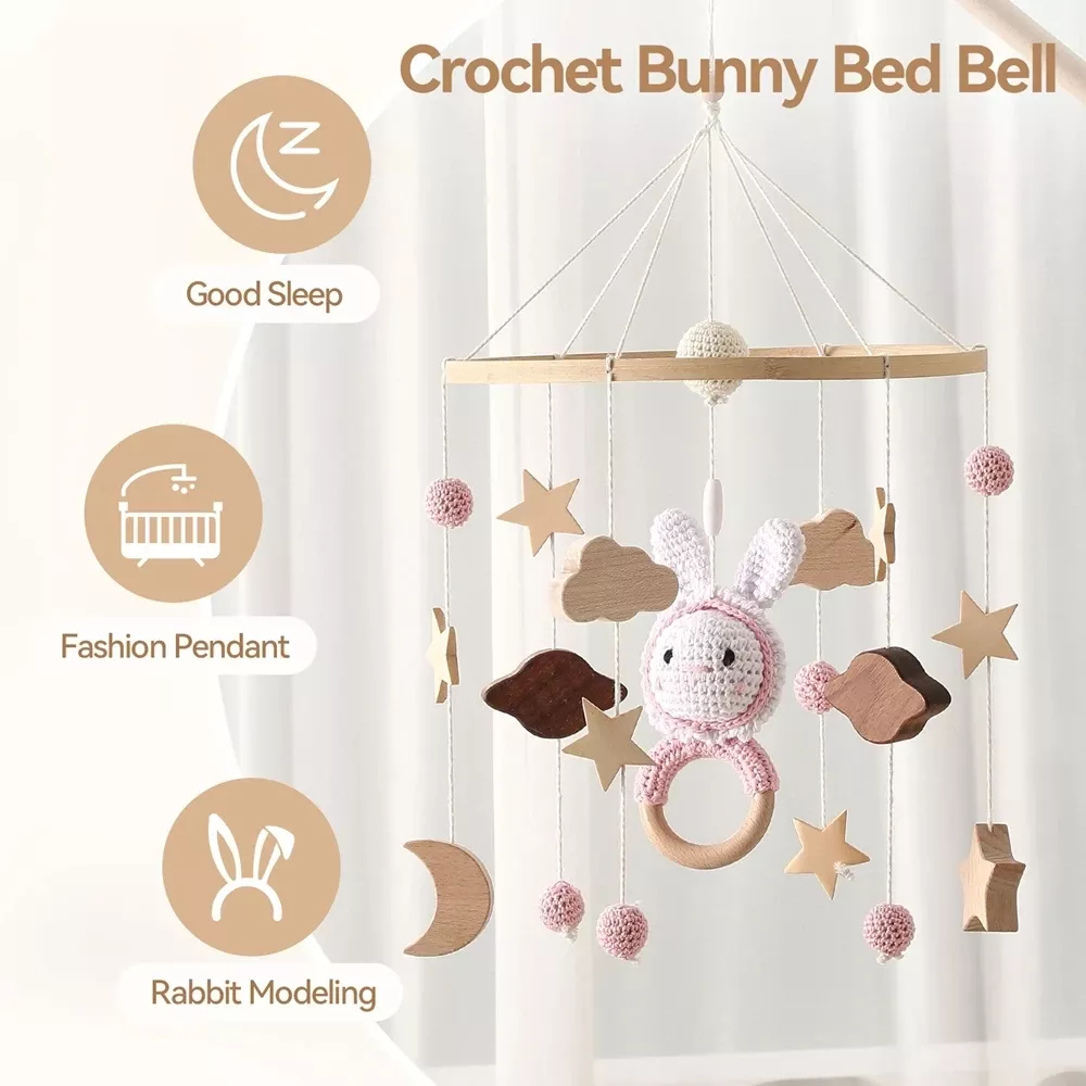 Transform your baby’s nursery into a cozy dreamland with this adorable pink crochet bunny crib mobile. Crafted with care and attention to detail, this beautiful wooden rattle mobile is designed to soothe, entertain, and delight your newborn. The gentle rotation and soft melody from the built-in music box create a calming environment that helps your baby drift peacefully to sleep. Perfect for both girls and boys, it brings a touch of warmth and charm to any crib or nursery décor.