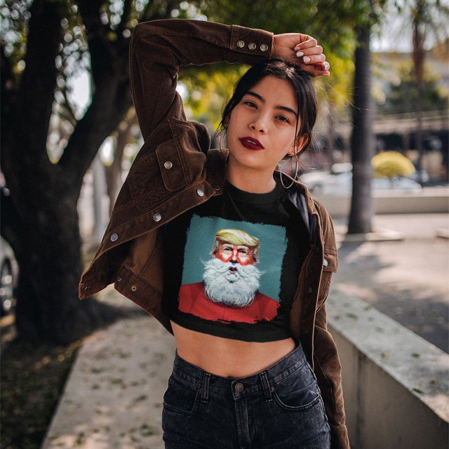 Santa Trump Women’s Cropped T-Shirt is no ordinary piece of clothing. Its form-fitting silhouette and soft fit and feel provide a retail fit for clothing that’s true to size.