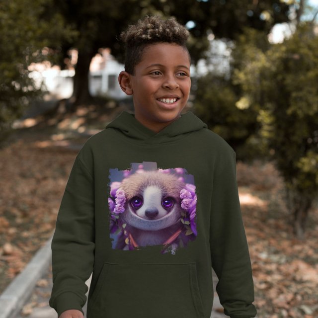 Sloth Design Kids’ Sponge Fleece Hoodie – Floral Kids’ Hoodie – Kawaii Hoodie for Kids