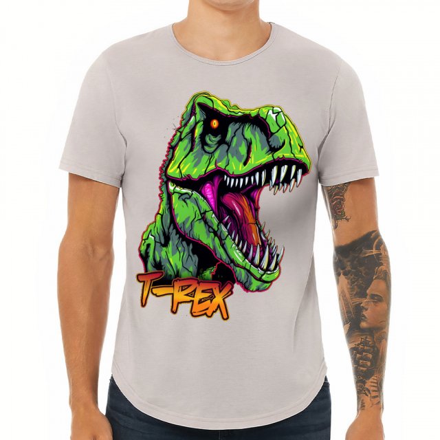 T-rex Print Curved Hem T-Shirt – Bright T-Shirt – Themed Curved Hem Tee