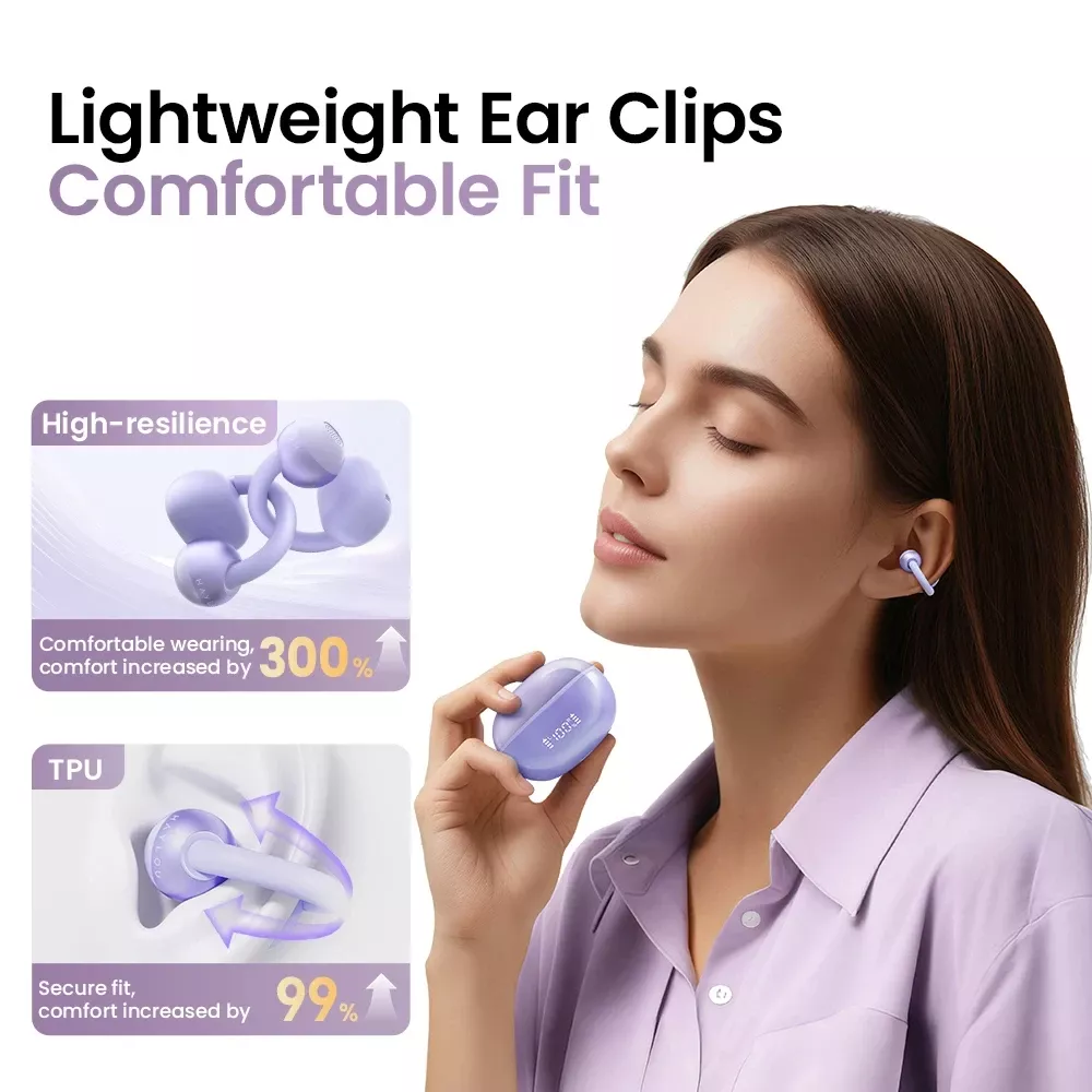 Crafted from ultra-light materials, these earbuds provide a feather-light, breathable fit that stays secure all day long. The open-ear clip design ensures maximum comfort during workouts, commutes, or long work sessions, letting you enjoy music and conversations without fatigue.