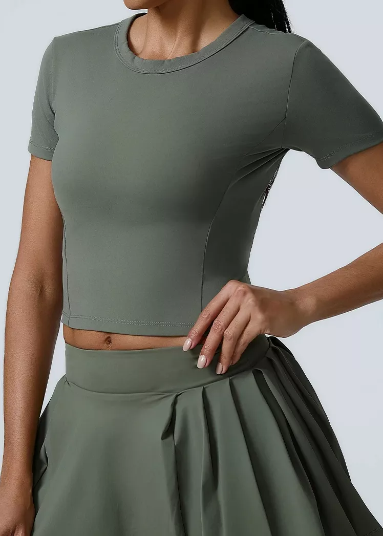 This short-sleeve performance tee is perfect for every season—spring, summer, autumn, or winter. Its breathable, moisture-wicking fabric keeps sweat at bay, while the quick-dry technology ensures you stay cool and fresh no matter how intense your workout gets. The anti-pilling and anti-wrinkle features maintain its smooth texture and shape after every wash, so you’ll always look polished, whether you’re training, dancing, cycling, or exploring the outdoors.